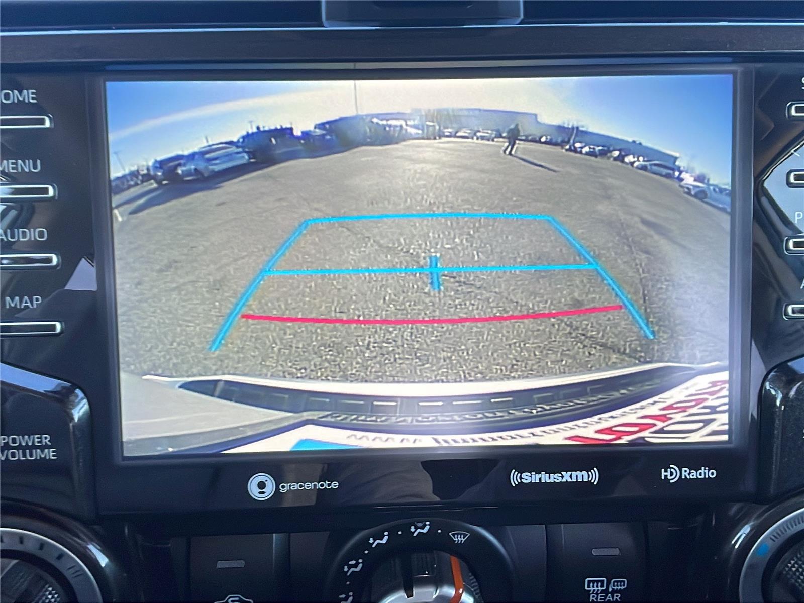 - The vehicle is equipped with a camera that displays an image of the area behind the vehicle on an interior display.