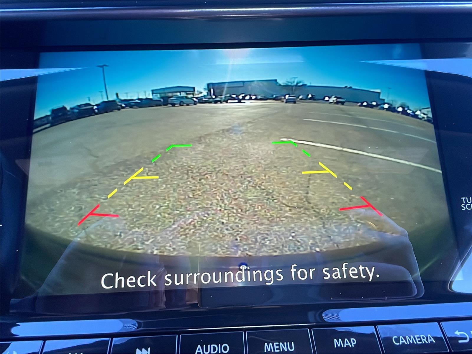 - The vehicle is equipped with a camera that displays an image of the area behind the vehicle on an interior display.